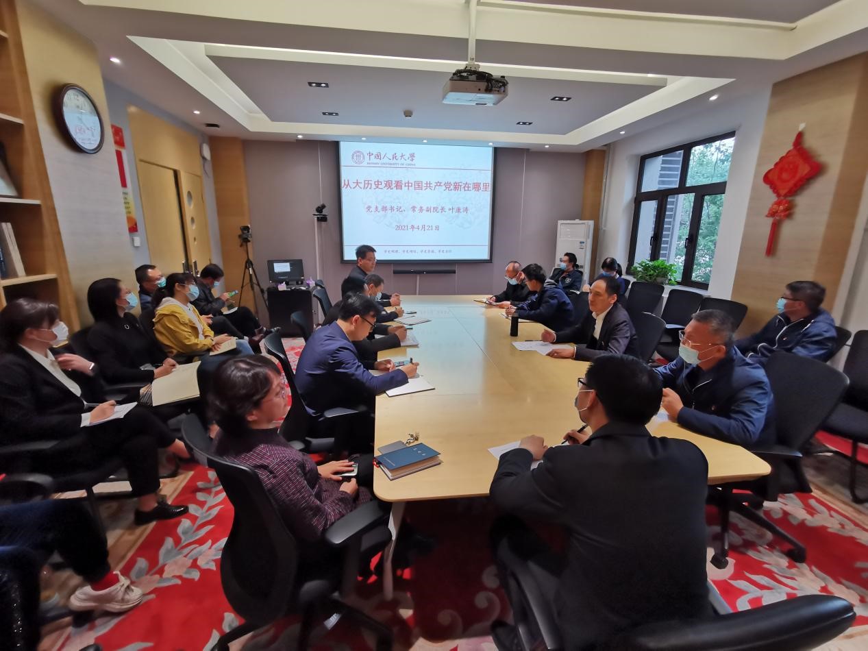 依照《研究生院黨史學習教育實施方案》的安排,2021年4月21日下午研究生院黨支部在崇德東樓312會議室開展黨史學習教育專題活動,黨支部書記、常務副院長葉康濤以“從大歷史觀看中國共產黨新在哪里”為主題講專題黨課。副院長李霞和支部黨員、積極分子、干部群眾共29人參加了本次學習,活動由支部委員劉宇主持。