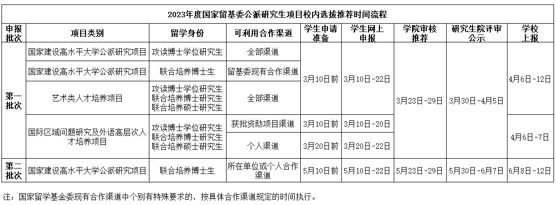 第一批3月10日前(“國際區域問題研究及外語高層次人才培養項目”中個人渠道申請準備階段為3月20日前),第二批5月10日前。