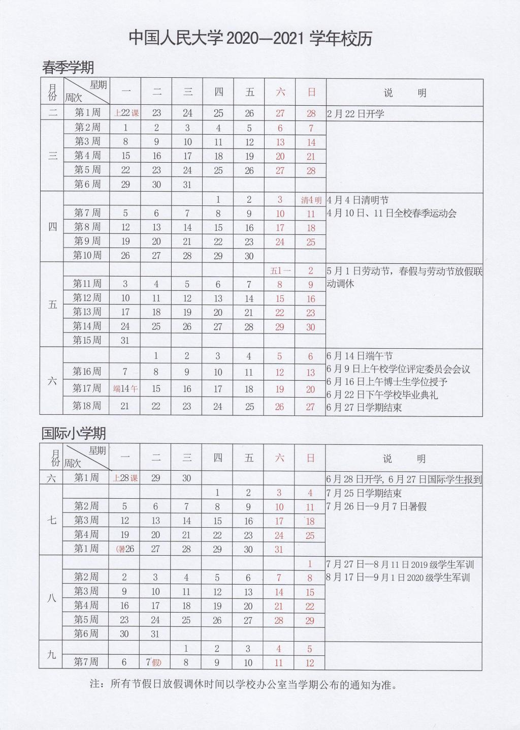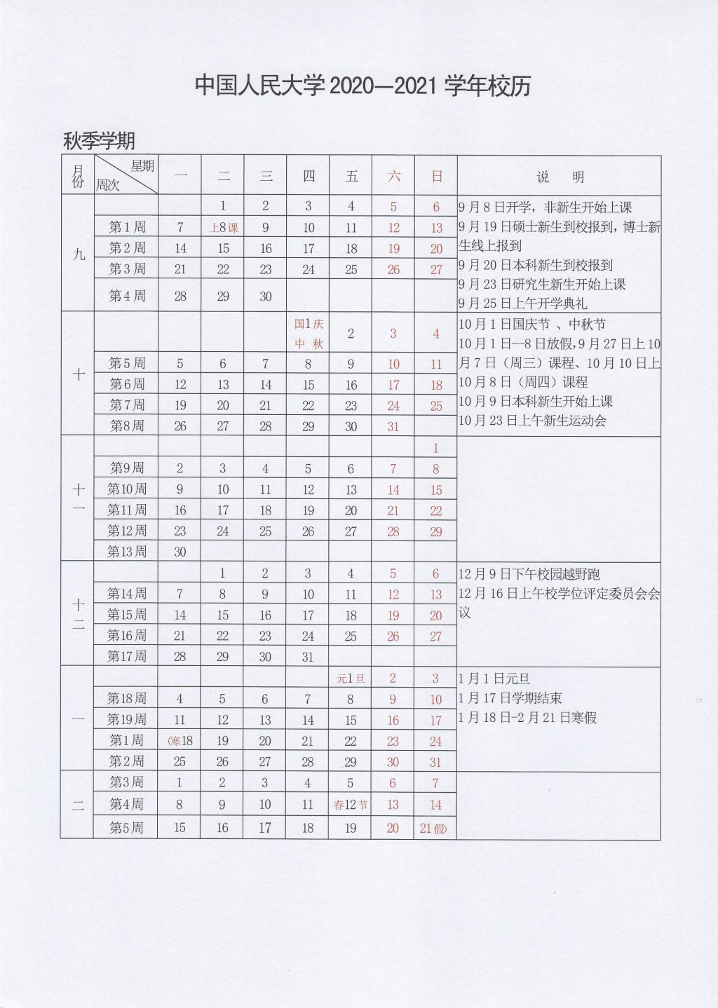 中國人民大學(xué)2020-2021學(xué)年校歷