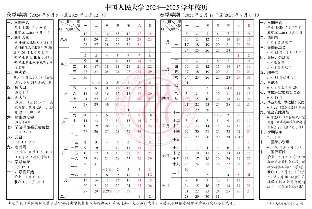 中國(guó)人民大學(xué)2024-2025學(xué)年校歷